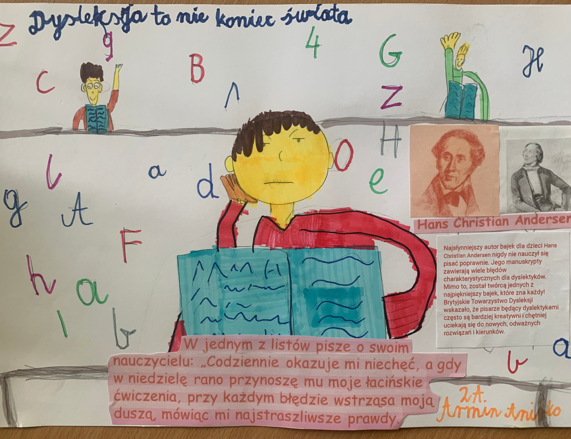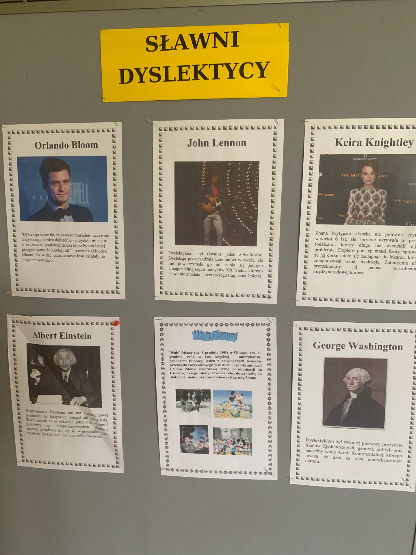 W dniach 2-6 października obchodziliśmy w szkole Europejski Tydzień Świadomości Dysleksji, w tym roku pod hasłem "Uczeń z dysleksją w cyfrowym świecie". Podczas lekcji pogłębialiśmy wiedzę na temat dysleksji, poznawaliśmy sławnych dyslektyków z różnych dziedzin kultury, sztuki oraz nauki. Wykonywaliśmy również prace plastyczne, które brały udział w szkolnym konkursie Znani dyslektycy.