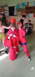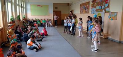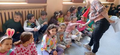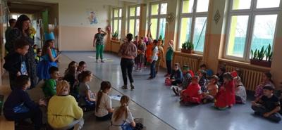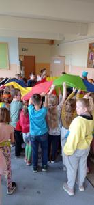 W czwartek 21 marca w ramach powitania wiosny uczniowie klas I-III wzięli udział w kolorowej zabawie. Podzieleni na grupy wcielili się w mieszkańców krain, w których wszystko było w wybranym kolorze. Aby przedstawić swoją krainę, tworzyli godła, okrzyki bojowe, jadłospisy oraz stroje ludowe - wszystko oczywiście w wylosowanym przez siebie kolorze. Po zaprezentowaniu swoich dzieł wspólnie stworzyli tęczową krainę, w której nie zabrakło zabaw z kolorową chustą Klanzy. KS
