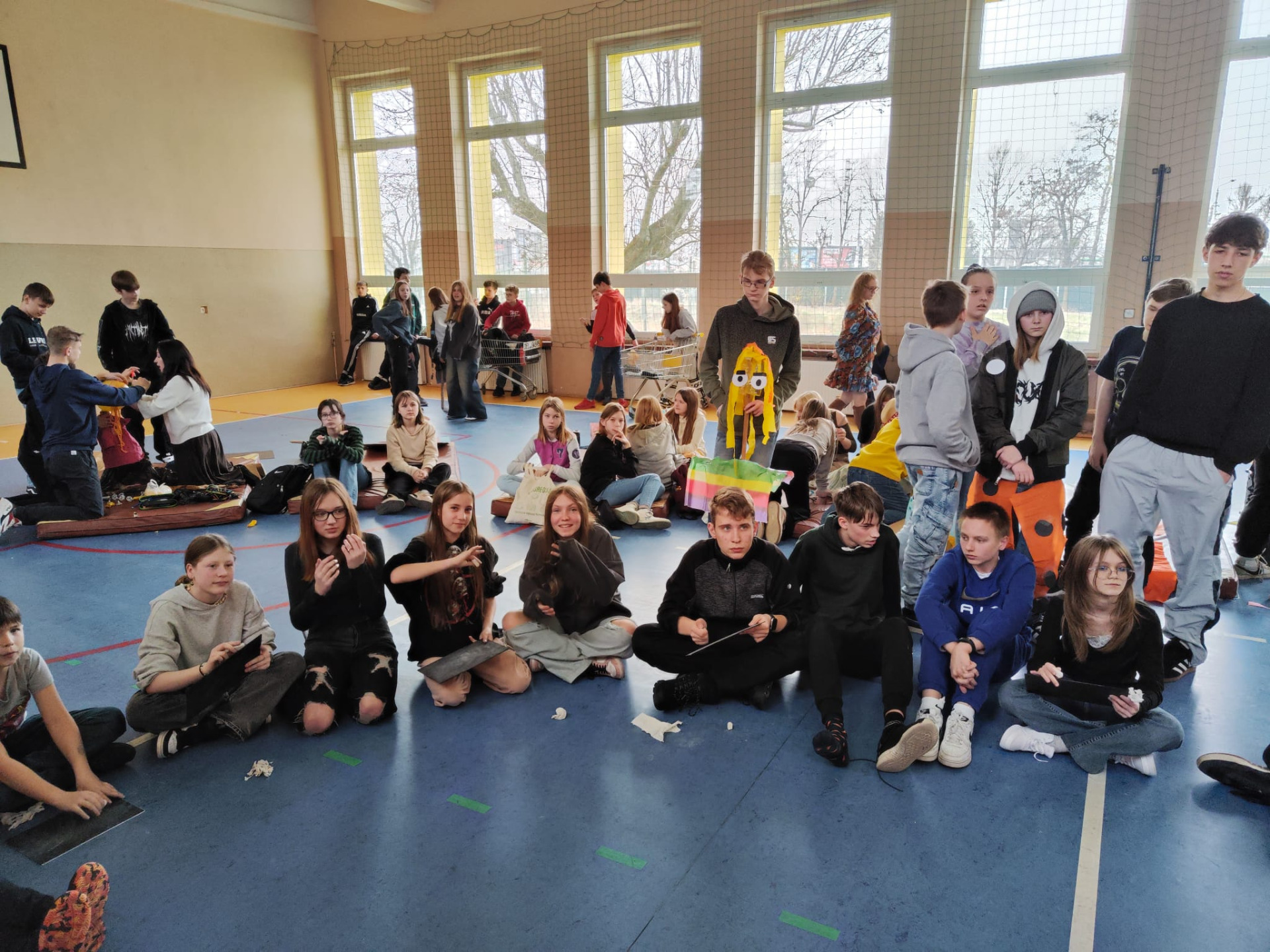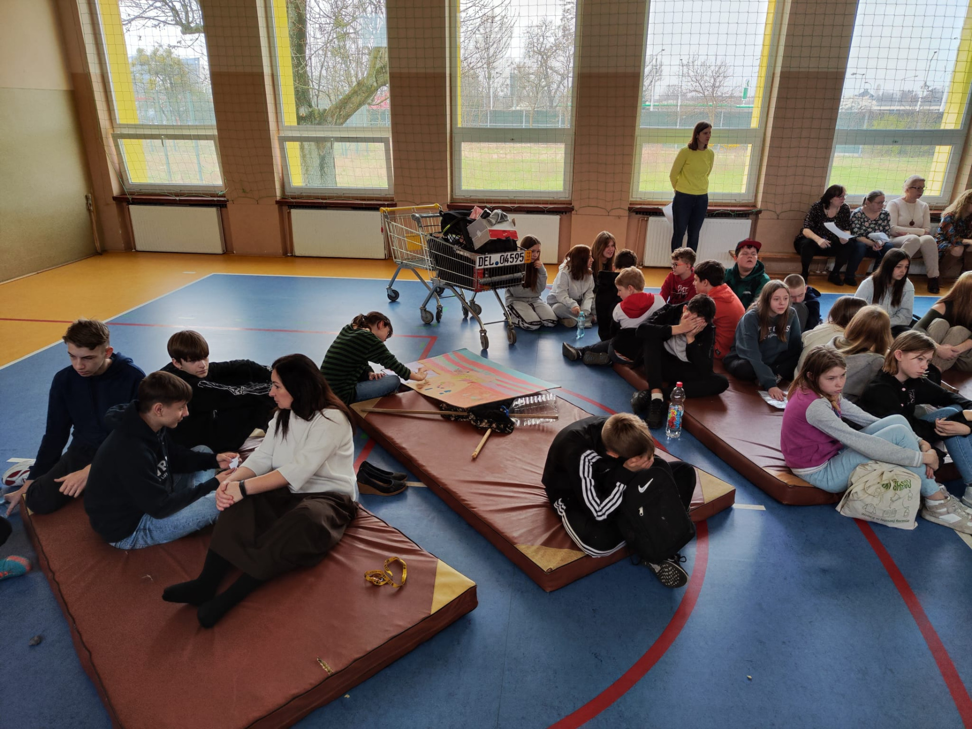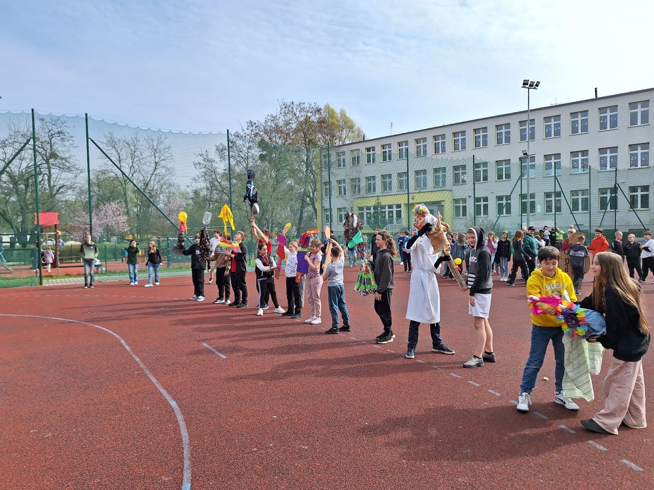 W czwartek 21 marca na wagary poszły u nas plecaki, za to w szkole pojawili się uczniowie z wózkami, siatkami, chlebakami i... mikrofalówką. Był to ważny dzień dla naszej szkolnej społeczności, bo w ten dzień zakończyliśmy coroczną Ligę Teligi. Uczniowie klas 4-8 od września mierzyli się z różnymi zadaniami, zdobywając skrupulatnie punkty. W czasie finału przedstawiciele klas wzięli udział w dwóch niełatwych quizach (o naszej szkole oraz ul. Traugutta i jej patronie), a pozostali tworzyli w tym czasie Marzannę z recyklingu. Na finale pojawiło się też zadanie specjalne, czyli Krystyna Czubówna przedstawia - uczniowie mieli za zadanie w formie filmu przyrodniczego przedstawić urocze epitylice. Po zaciętej walce jury podsumowało wszystkie punkty i z wielką przyjemnością statuetkę Mistrza Ligi Teligi wręczyliśmy klasie 8b. Na zakończenie zabawy pozbyliśmy się zimy, wykonując rzut Marzanną do celu.