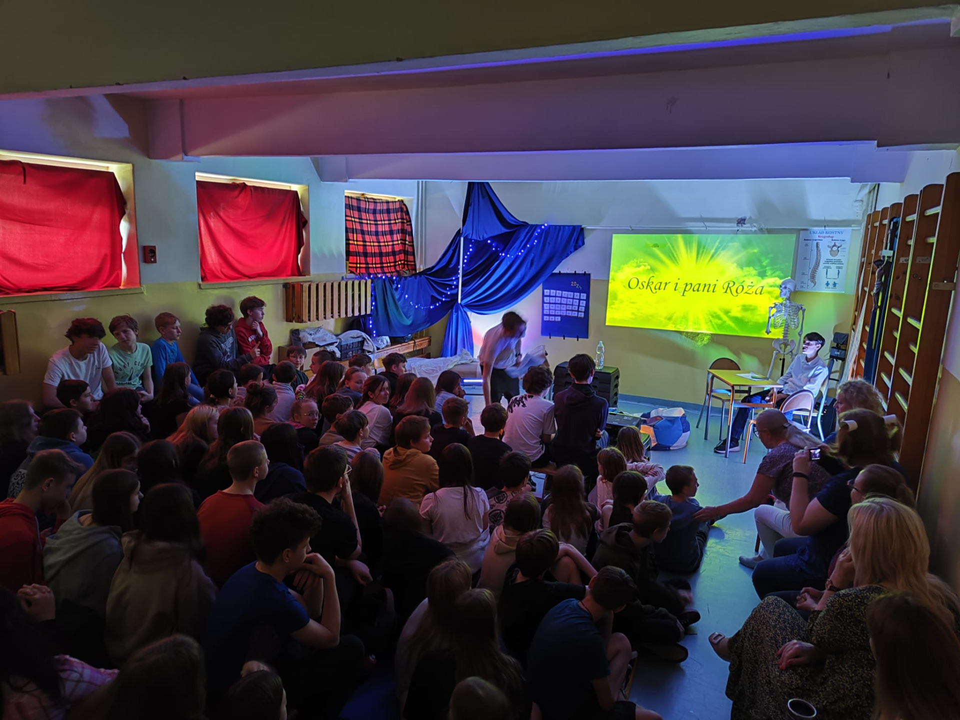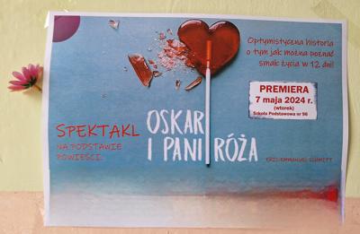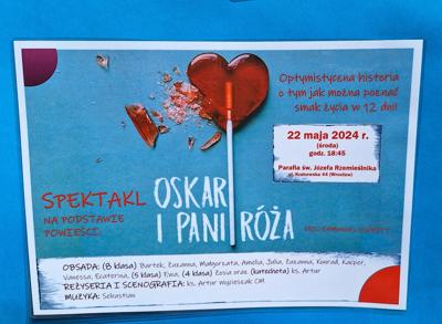 Są historie, które mogą wiele zmienić i na zawsze odcisnąć piętno na naszej duszy. Jedną z nich jest opowieść francuskiego pisarza, Erica-Emmanuela Schmitta "Oskar i pani Róża". Dzięki szkolnej grupie teatralnej uczniów klas ósmych ze wsparciem młodszych dziewczynek i pod wodzą ks. Artura mieliśmy okazję dwukrotnie przenieść się w trudny świat śmiertelnej choroby dziecka, ale i nadziei i duchowej odmiany. Tematy niełatwe, a tak nam przecież bliskie, nasi uczniowie przedstawili w sposób niezwykle dojrzały, ale i z pewną dozą poczucia humoru, od siebie dodając emocje i młodzieńczą ufność, że wszystko będzie dobrze. Dziękujemy Wam za tę nadzieję. Jesteśmy z Was dumni. Premiera odbyła się 7 maja 2024 na terenie szkoły, na drugie przedstawienie uczniowie zaprosili swoich bliskich do parafii św. Józefa Rzemieślnika przy ul. Krakowskiej 22 maja.