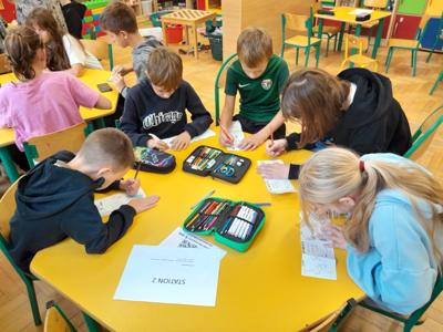 Z okazji Europejskiego Dnia Języków w naszej szkole odbyły się specjalne warsztaty językowe dla uczniów klasy 4 b. W zajęciach wzięli również udział uczniowie klasy 5b z zaprzyjaźnionej szkoły SP nr 85, z którą współpracujemy już od wielu lat. Podczas warsztatów uczniowie pracowali w grupach, wykonując różnorodne zadania w ramach stacji językowych. Warsztaty te z jednej strony rozwijały umiejętności językowe, z drugiej strony stworzyły możliwość współpracy i integracji z rówieśnikami z innej szkoły. Po zakończeniu części warsztatowej na uczestników czekał słodki poczęstunek, który był okazją do rozmów i nawiązania nowych znajomości. Spotkanie przebiegło w miłej, twórczej atmosferze i z pewnością ze względu na ciekawą formę pozostanie w pamięci uczniów. AM