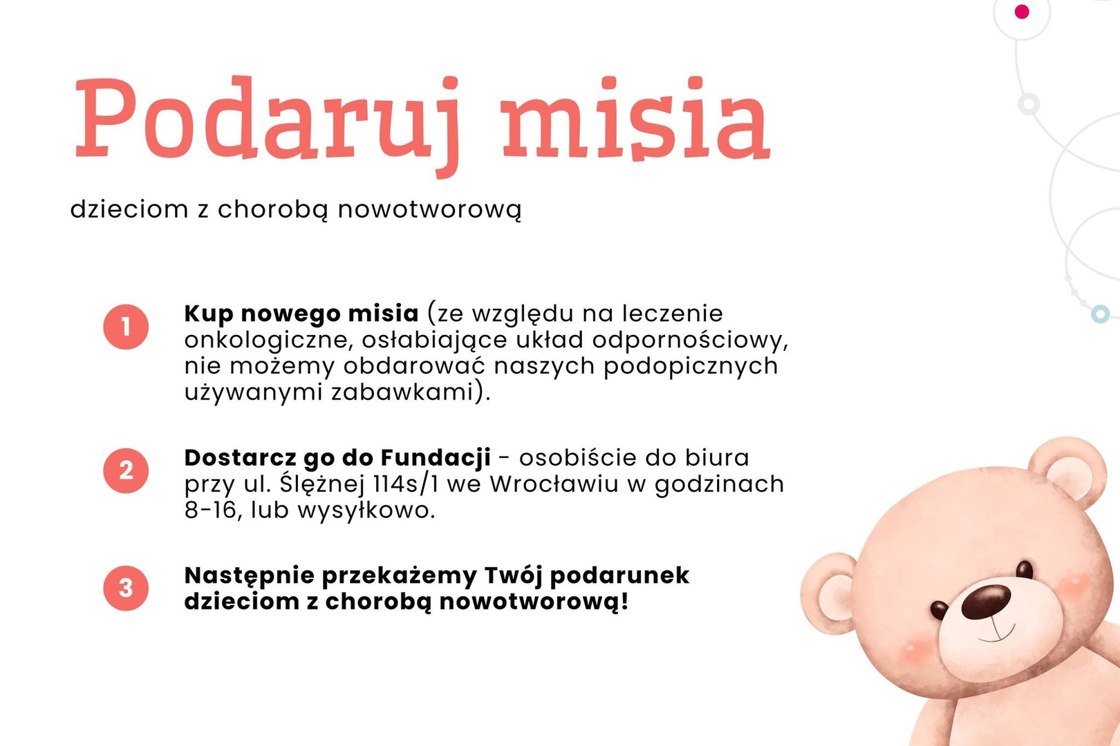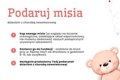 Osoby chętne do dołączenia do akcji proszę o przyniesienie do sali 53 NOWEGO pluszowego misia (proszę pamiętać, że dzieci z chorobą nowotworową mają osłabioną odporność i używane zabawki nie są dla nich bezpieczne).